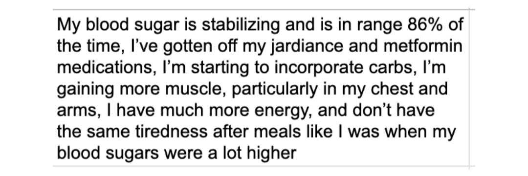 He was originally diagnosed with type 2 diabetes. His blood sugar would shoot into the two hundreds even with small amounts of carbs. He was losing muscle, battling gas and bloating, and felt so fatigued that he needed daily naps and struggled to stay awake on his hour long commute. He tried: